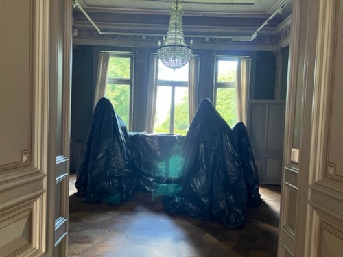 4 schwarze Baufolien, 400 x 400 cm, 600 x 400 cm, Tisch, Eiche, 200 x 90 x 75 cm, 5 Stühle, 140 x 50 x 50 cm, 24 Stühle 110 x 40 x 40